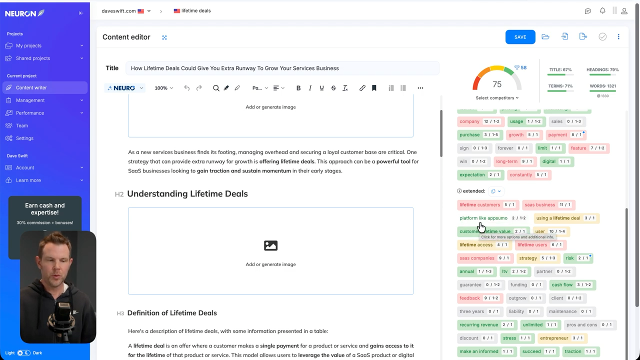 Neuron Writer is back—this was AppSumo's 2023 Tool of the Year. It's designed to help you create SEO-optimized content with competitor analysis and NLP term suggestions built in.