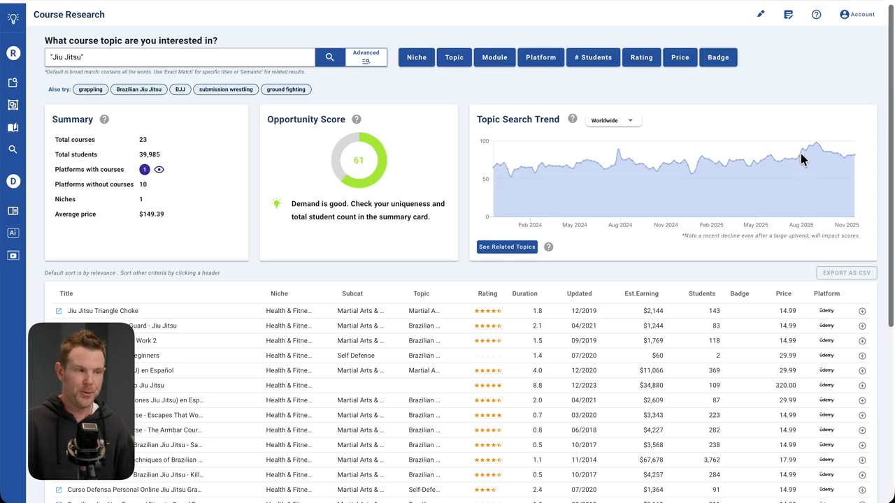 I tested this with "jujitsu" as an example. Eureka found 23 courses on the topic with about 40,000 total enrollments, all on Udemy. The average sale price was $150, which is surprisingly high for Udemy courses—most seem to sell in the $15-20 range.