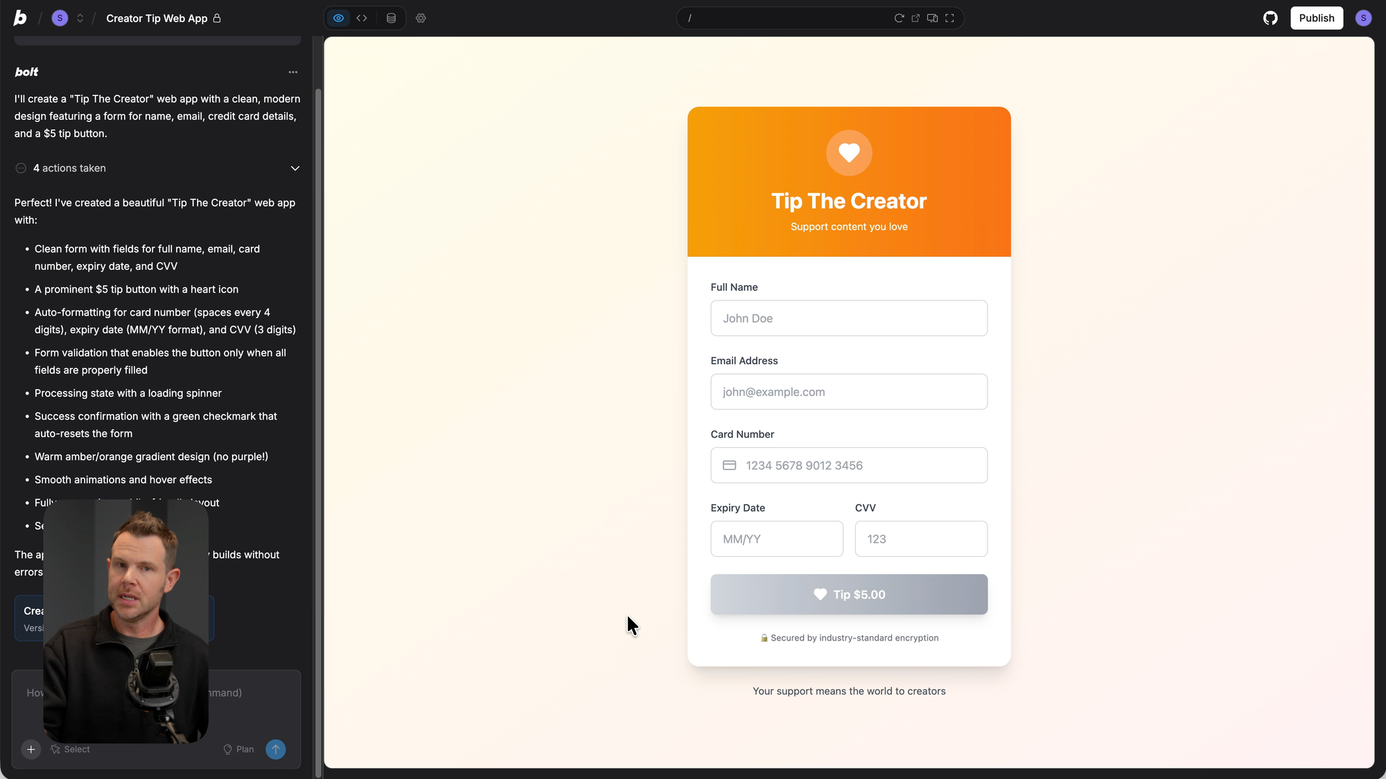 For my test, I asked it to build a "tip the creator" web app with a name field, email field, credit card form, and a $5 tip button. Within moments, it had a working interface ready.