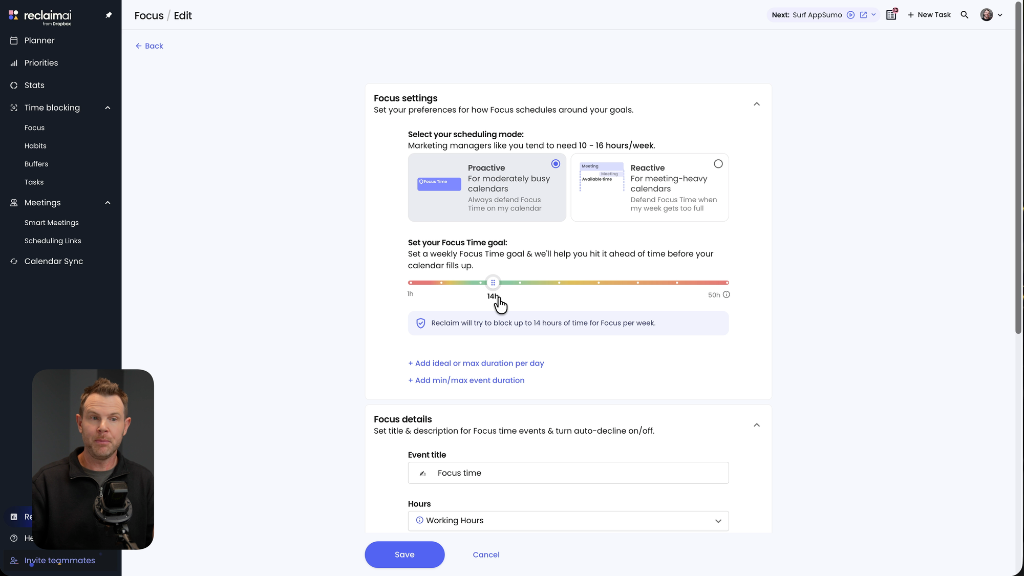 Inside your working hours, you probably need blocks of uninterrupted time to do actual work. Reclaim calls this Focus Time, and you can set a weekly goal. I chose 14 hours per week.