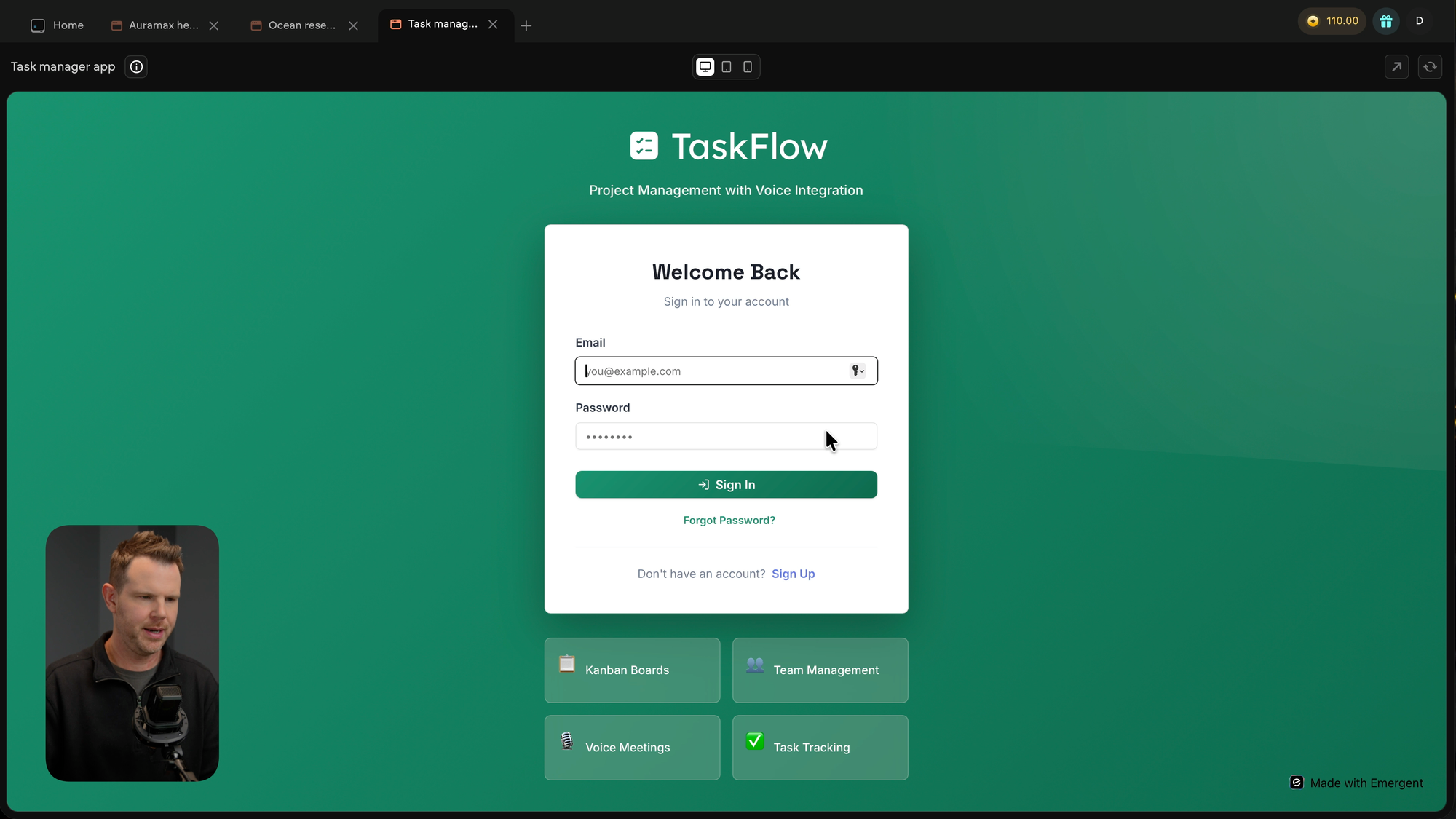 I tested the task manager. It had a full login system, Kanban boards, and team management features. I created an account, added tasks, and moved them around the board. This wasn't a mockup – it was a functional application built from a single prompt.